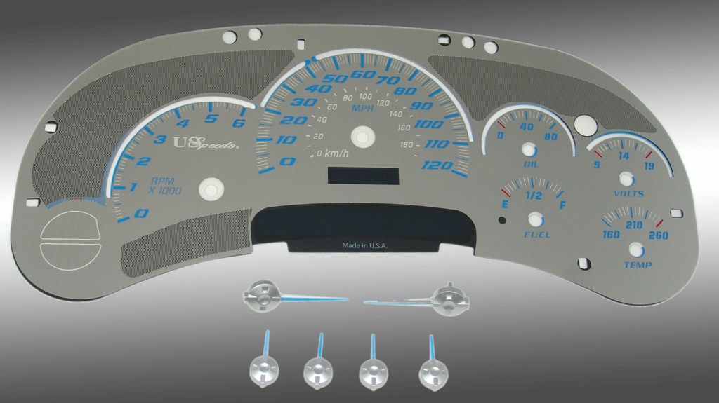 Replace your boring factory Silverado gauge faces with a Stainless Steel Gauge Face from US Speedo. These gauge faces are made of true stainless steel with a variety of color and style options. Made in the USA!
