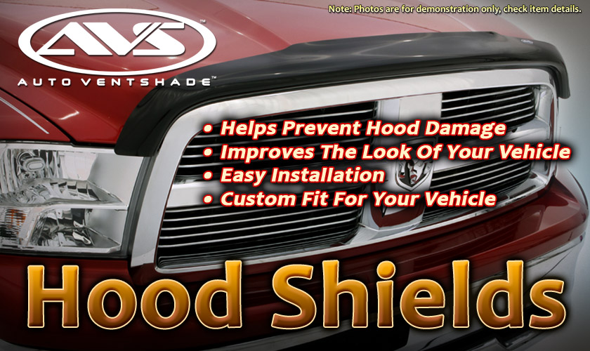 | Protect the hood and paint of your 1997 1998 1999 2000 2001 2002 2003 2004 Dodge Dakota with a Bugflector™ Hood Shield from AVS. These attractive and stylish hood shields are an easy and cost effective way to prevent stone chips and bug guts from eating the paint of your Dodge Dakota hood. The Bugflector™ Hood Shield is the original way to protect the hood of your Dodge Dakota. | |